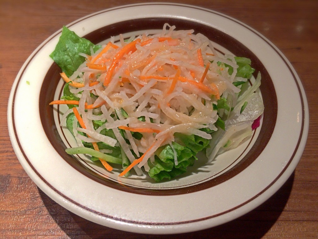 ミニサラダはレタス、細切りの大根とニンジン、キュウリに、酸味の効いたドレッシングが掛かったものです。
