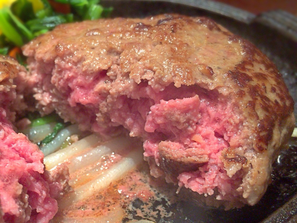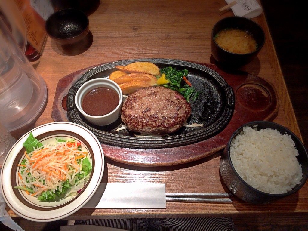 ハンバーグは熱々のステーキ皿に乗せられて、ジュージューと音を立てています。