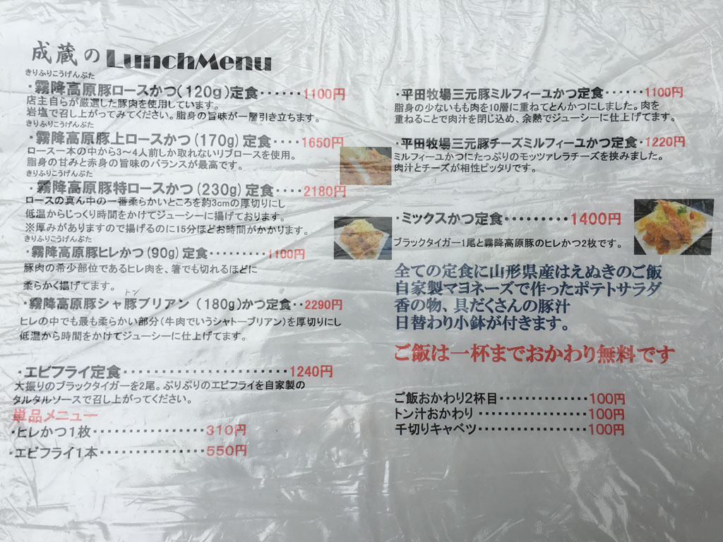 ランチメニューは、定番のロースかつやヒレかつをはじめ、エビフライなどの定食が9種類。
