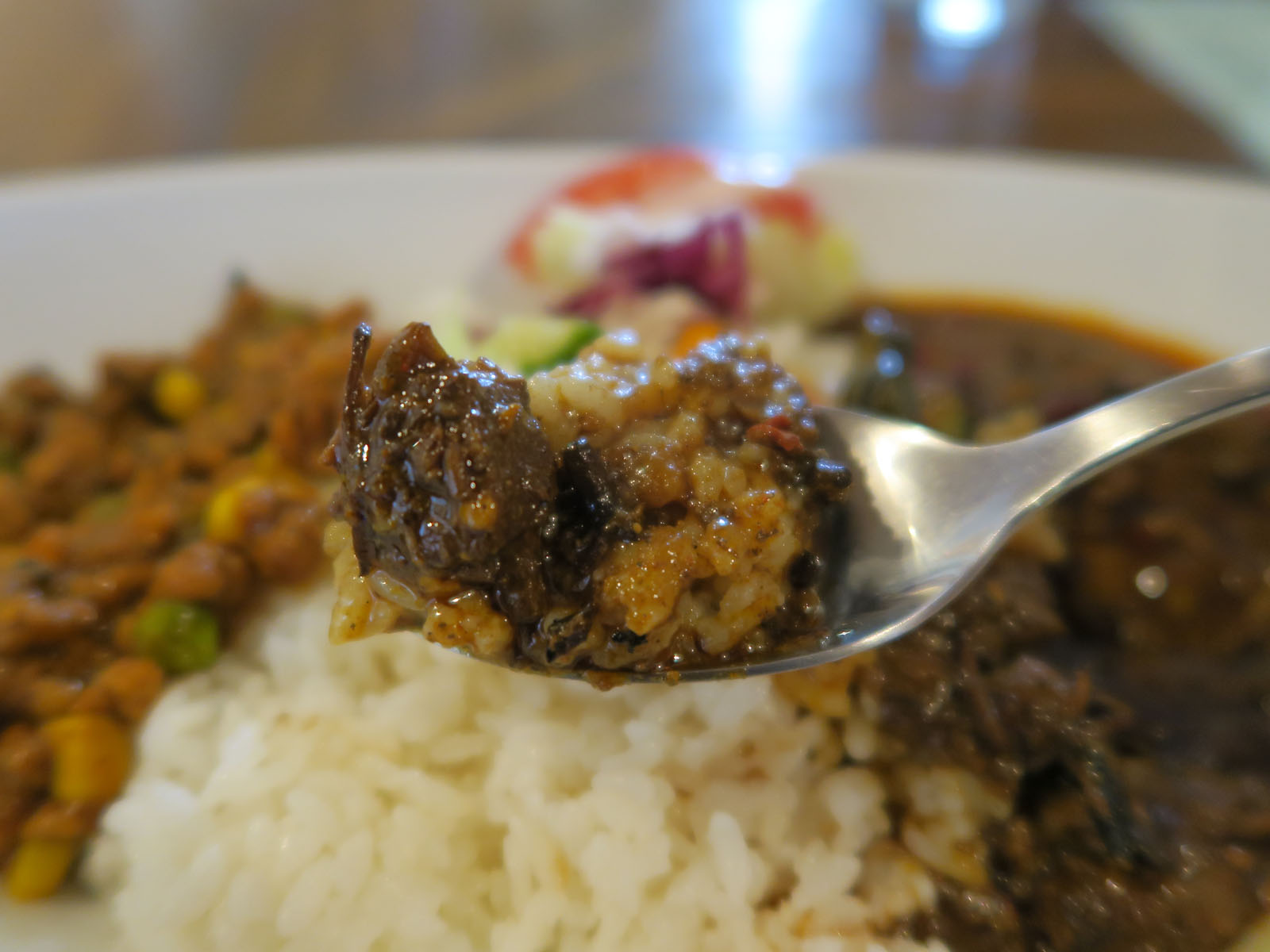 とろみはなくてサラサラしており、ホールのクローブやレッドチリ、細かく煮崩れた牛肉がたっぷり入っています。