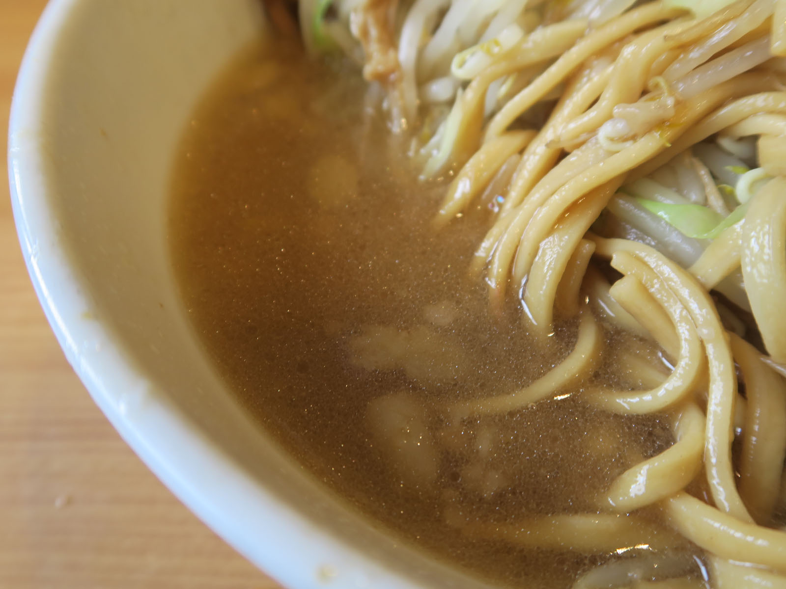 スープは表面に背脂が浮かんだ茶濁色で、乳化しています。