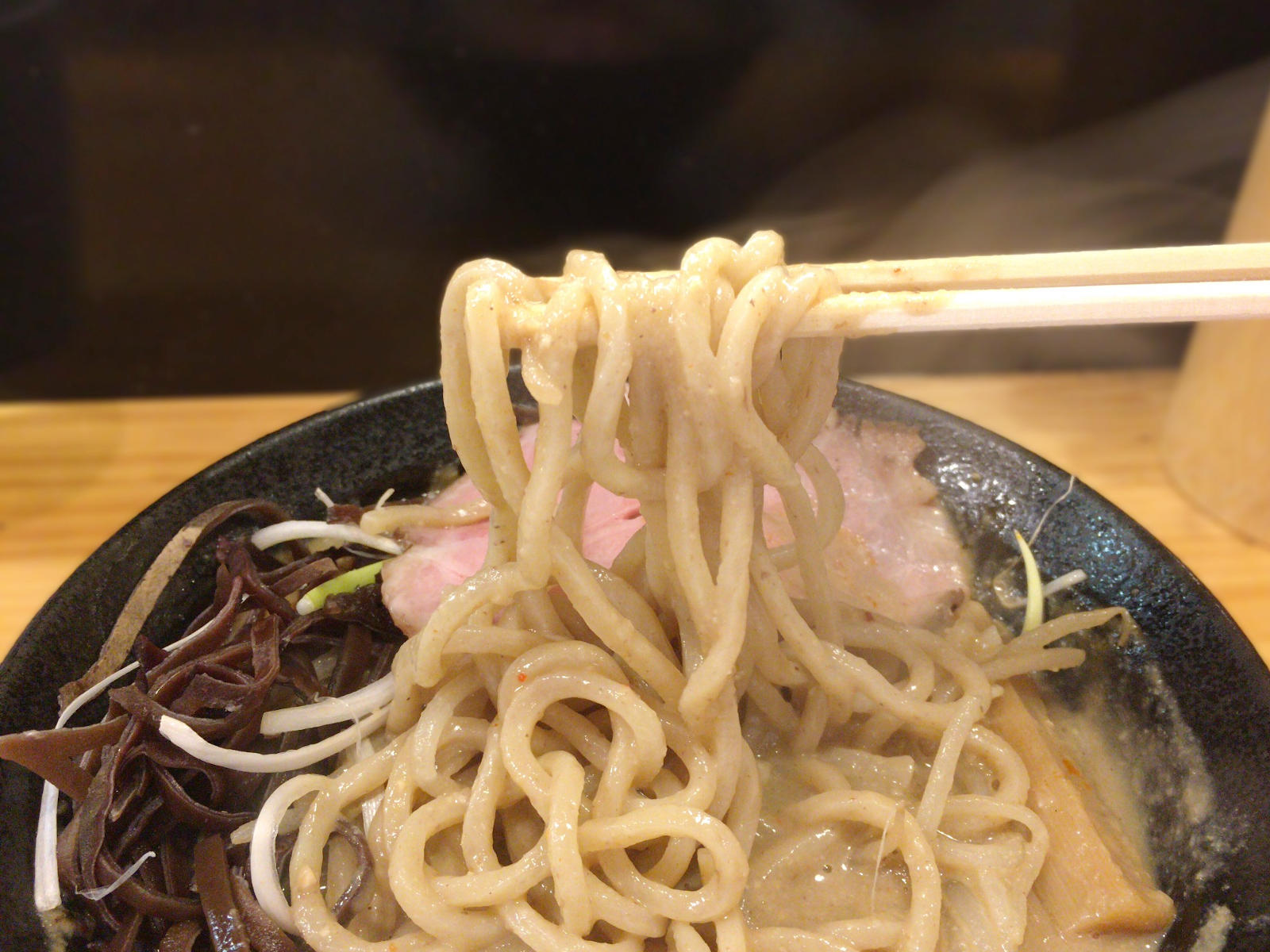 絡み付いたドロドロのスープにも負けない存在感のある麺です。
