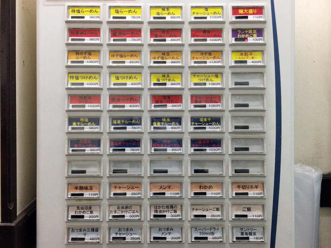 メニューは塩らーめん、ゆず塩らーめん、塩煮干らーめん、塩つけめん、醤油らーめん、醤油煮干らーめん、醤油つけめんがメイン。