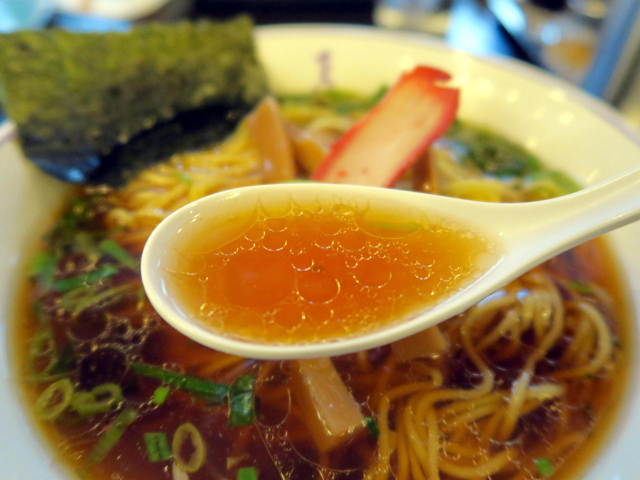 スープは澄んだ琥珀色で、表面には油がキラキラと輝いています。