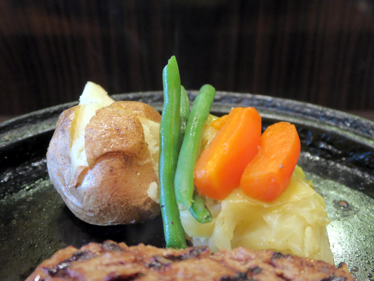 付け合わせはジャガイモとインゲン、ニンジン、キャベツ。