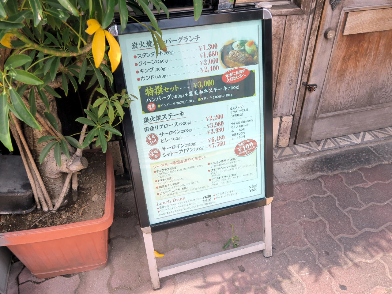 ランチメニューは炭火焼ハンバーグランチと特撰セット(ハンバーグ+黒毛和牛ステーキ)、炭火焼ステーキがあり、全品にスープとサラダ、ライスが付いています。