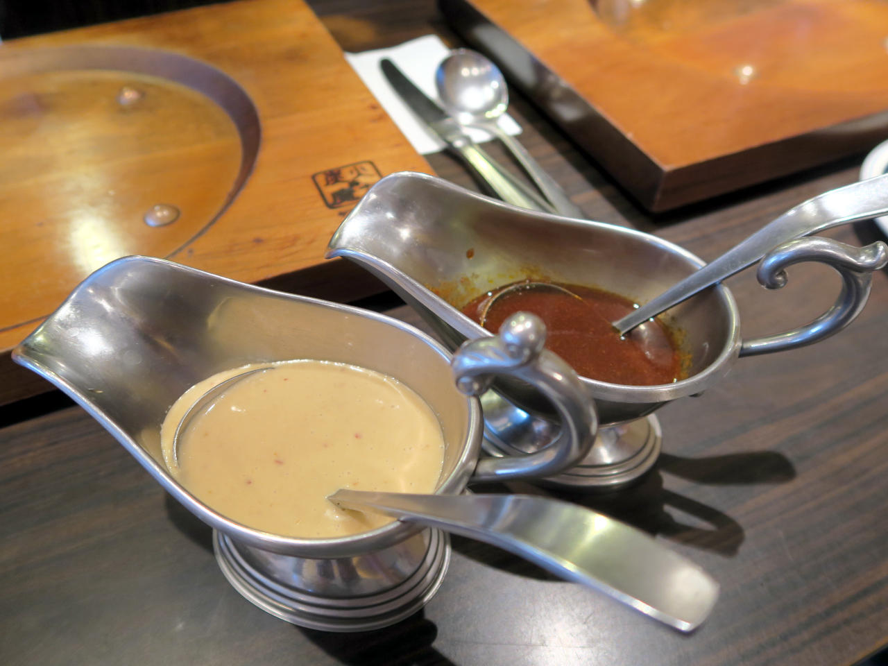 ソースはステンレス製のグレービーボートに入れられて提供されます。