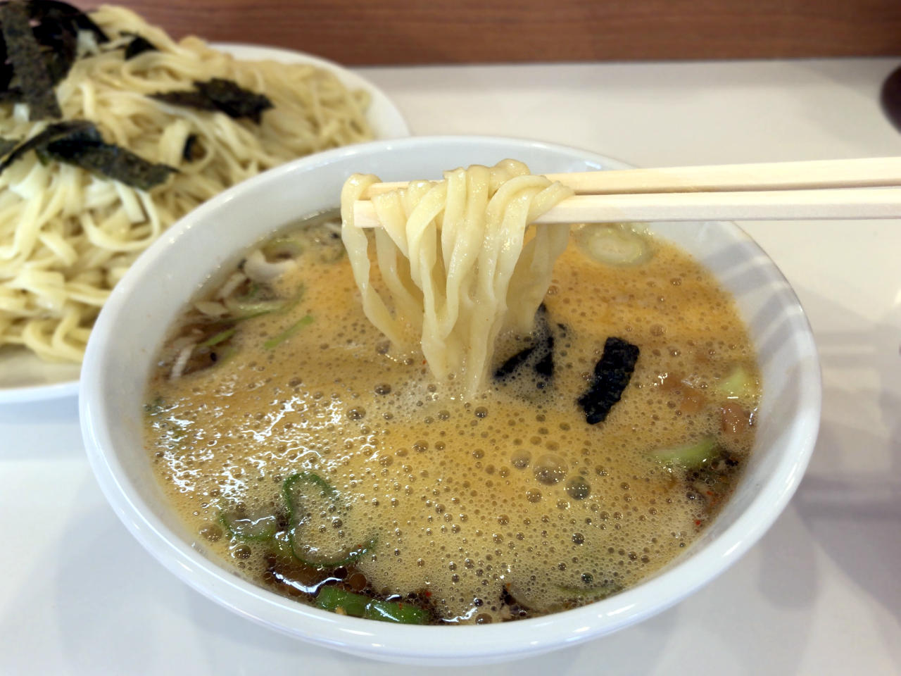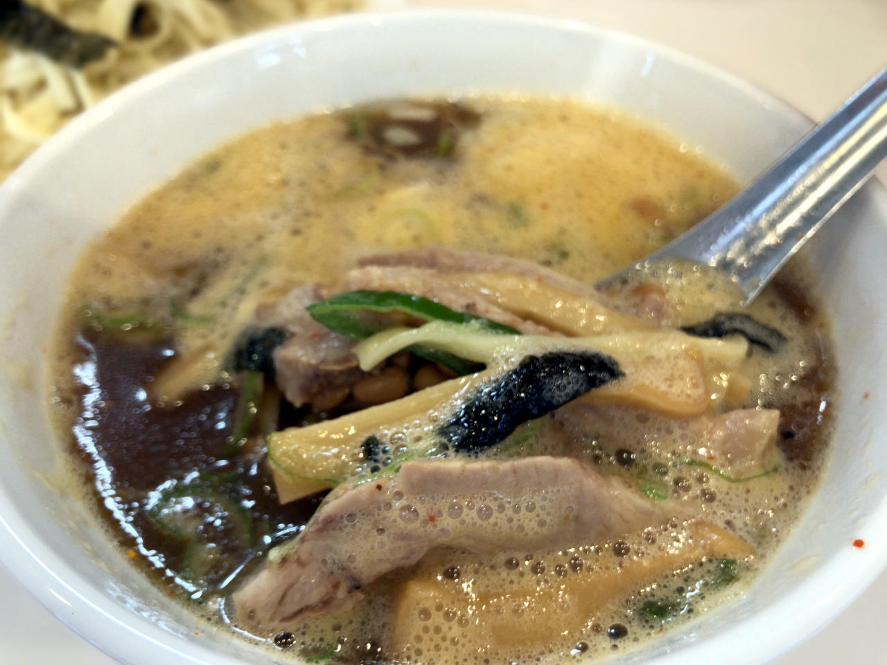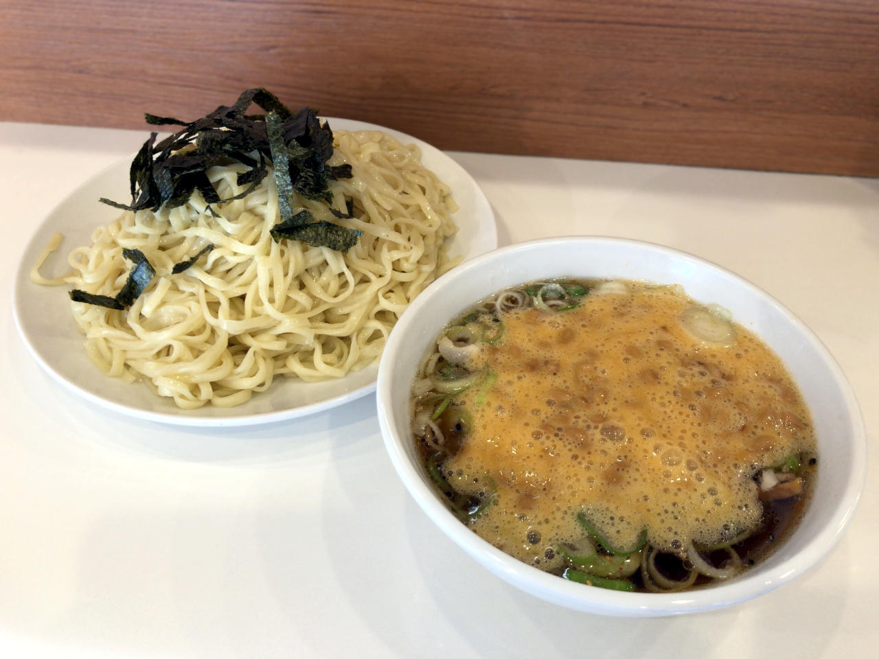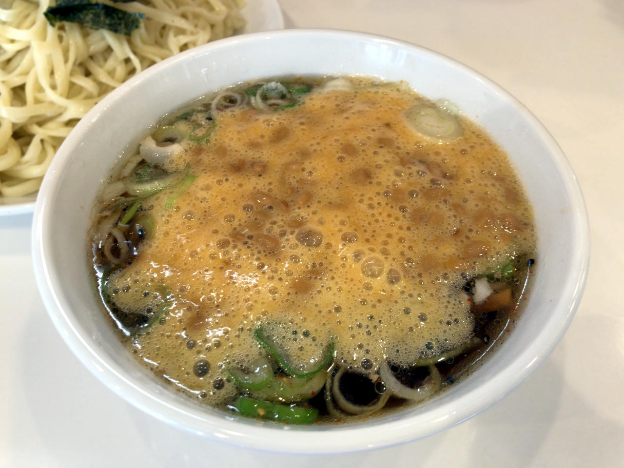 つけ汁は濃い醤油色をした清湯で、生玉子とともにかき混ぜられた納豆の泡で覆われています。