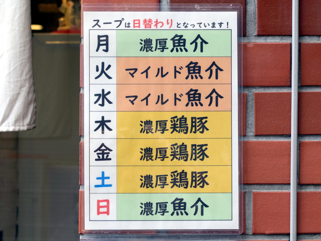 スープが曜日替わりで、日曜と月曜が濃厚魚介、火曜と水曜がマイルド魚介、木曜と金曜と土曜が濃厚鶏豚を提供しています。