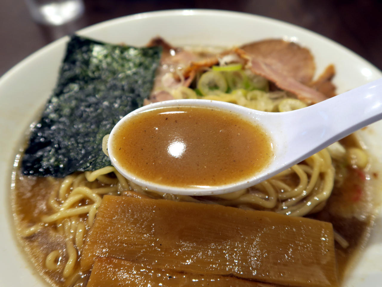 豚ゲンコツ、豚足、鶏ガラ、モミジ等を煮込んだ動物系出汁に、サバ、イワシ、宗田節、本枯節等から取った魚介系出汁を加え、醤油ダレを合わせたものだそう。