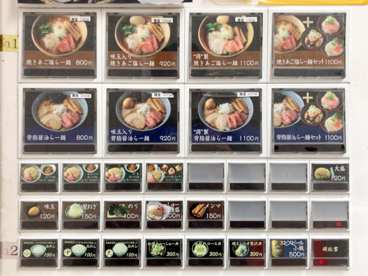 メニューは焼きあご塩らー麺、背脂醤油らー麺、塩つけ麺の3種類。