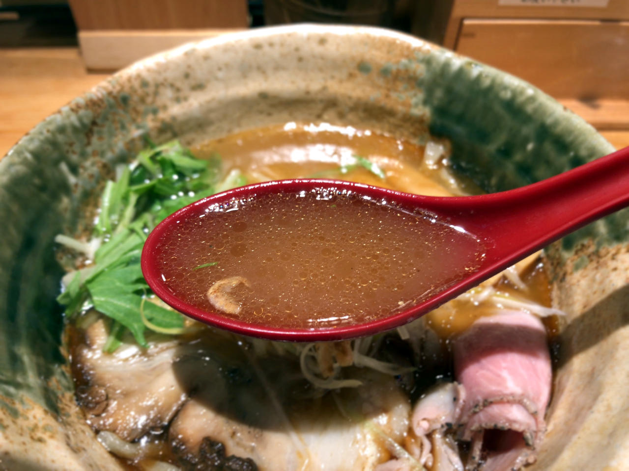 スープは半濁の茶褐色で、褐色の香味油が薄く張っています。
