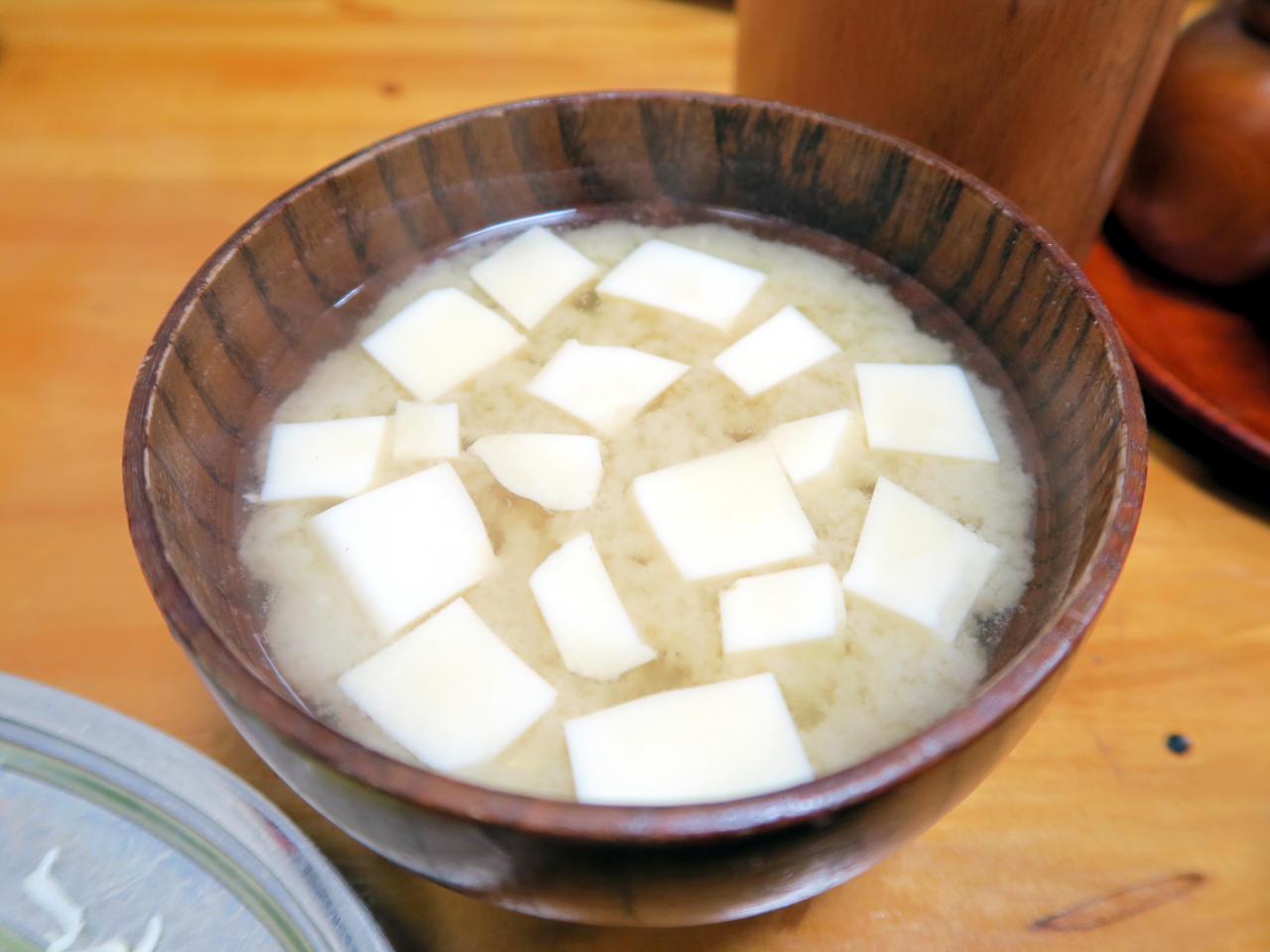 味噌汁は白味噌仕立てで、小さく賽の目に切られた絹ごし豆腐が沢山入っています。