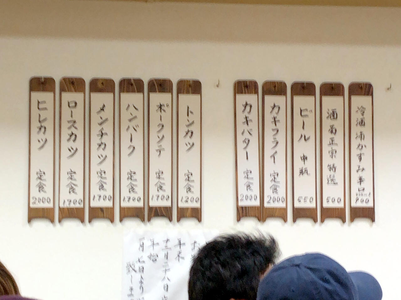 メニューはトンカツ定食、ポークソテー定食、ハンバーグ定食、メンチカツ定食、ロースカツ定食、ヒレカツ定食とシンプル。