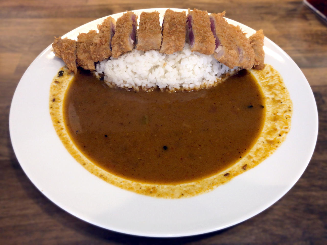 牛カツカレーはカレーソースとライス、牛カツが一皿に盛られていて、牛カツがカレーソースに浸らないようにライスの上に乗っています。