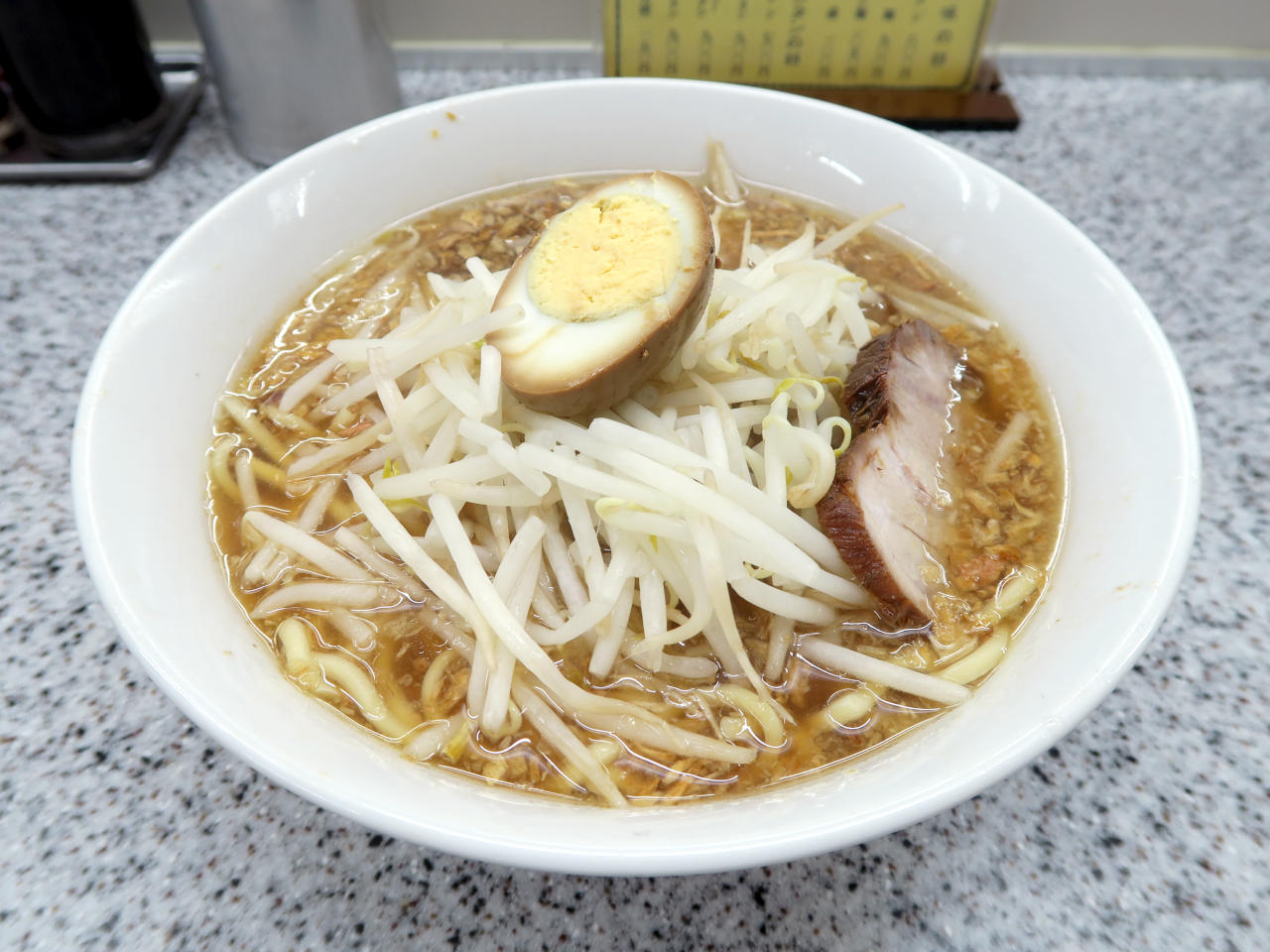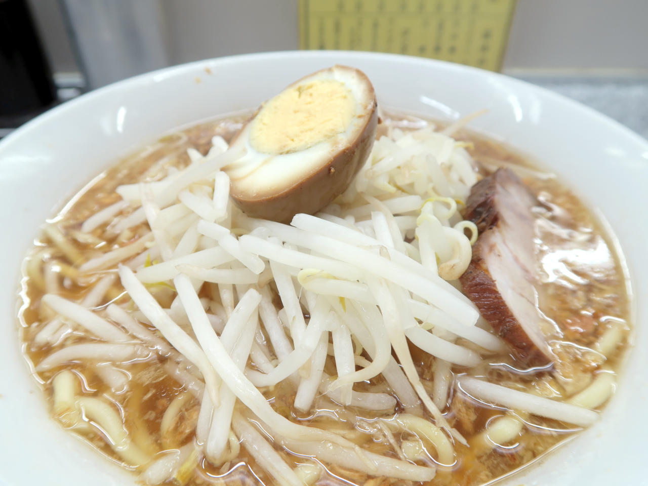 具は茹でたモヤシの上に味玉半分とチャーシューが1枚のっています。
