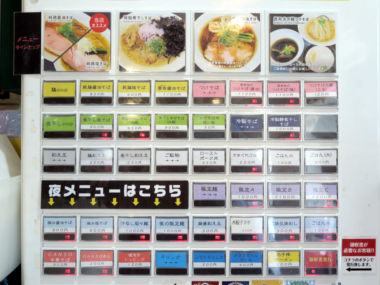 メニューは券売機を見ると昼と夜で違うようですが、昼は純鶏醤油そば、純鶏塩そば、昆布水のつけそば、煮干し塩そば、煮干しまぜそば、冷製鯵煮干しそばなど種類が多くて悩みますね。