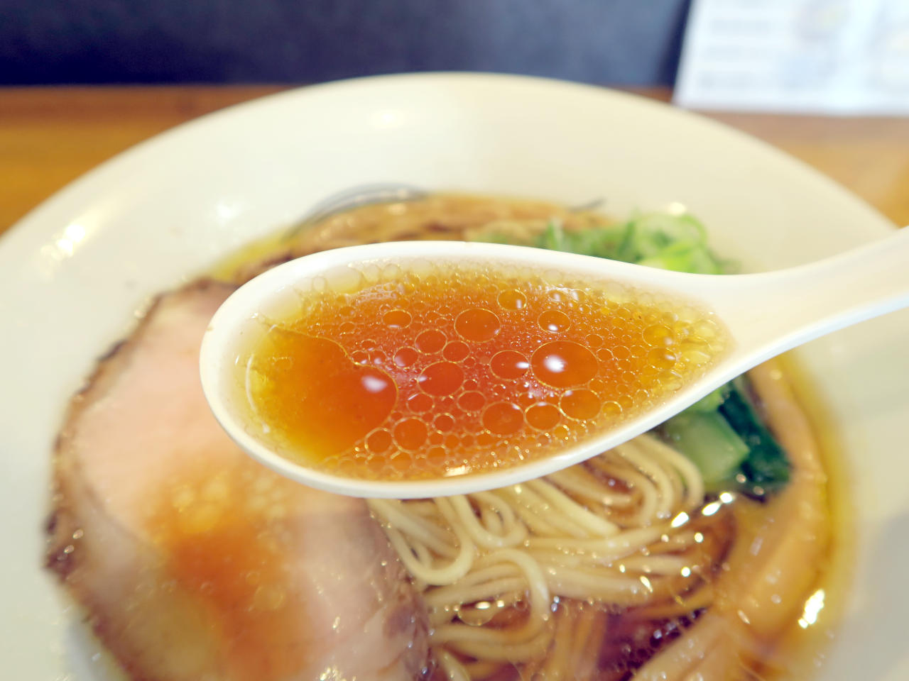 スープは澄んだ琥珀色をしており、表面を香味油が覆っています。