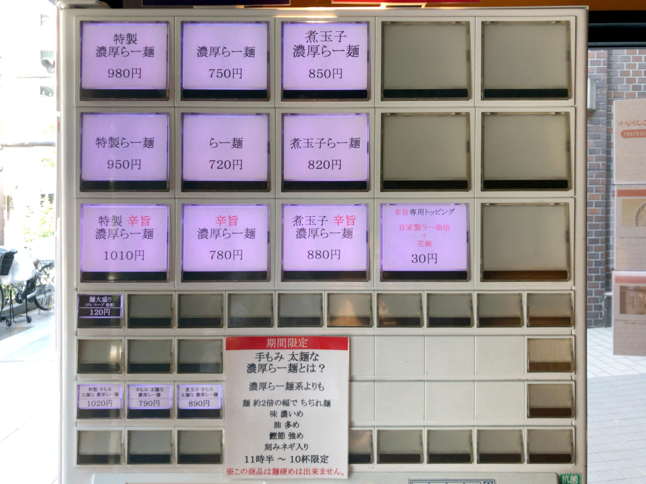 メニューは濃厚らー麺、らー麺、辛旨濃厚らー麺の基本3種類で、それぞれに特製と煮玉子のトッピングによるバリエーションがあります。