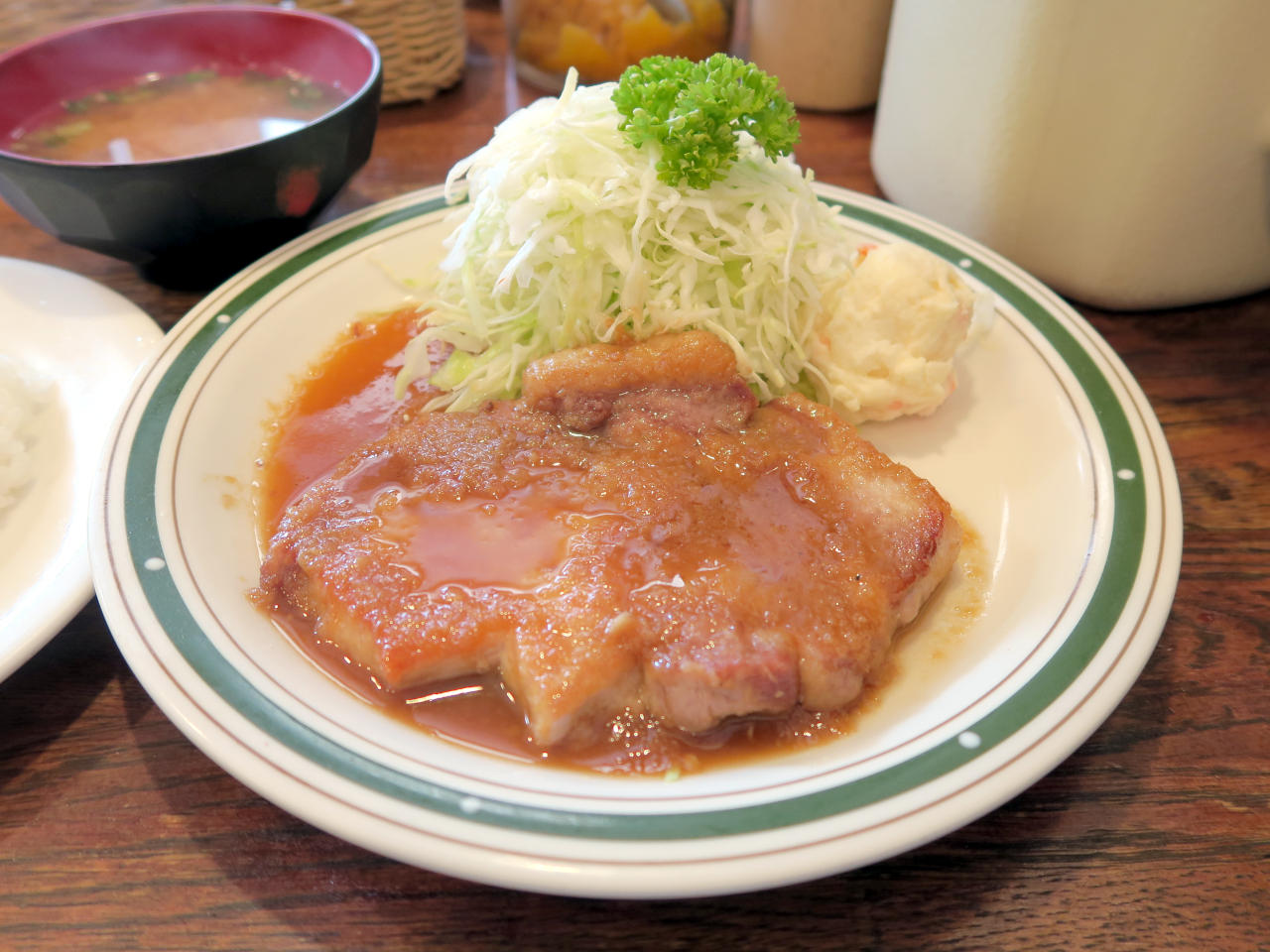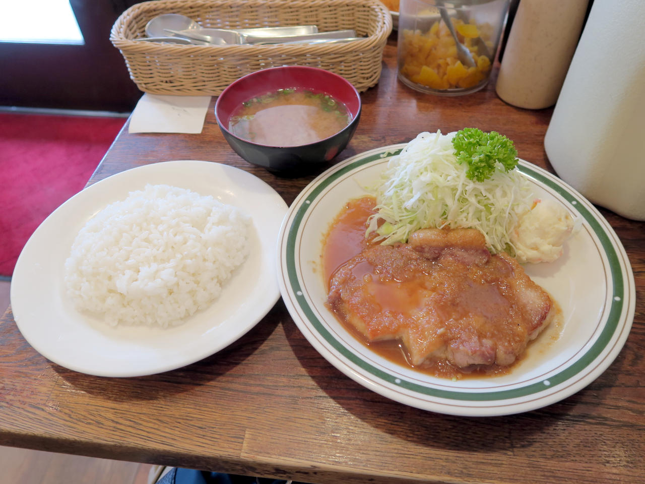もち豚ポークジンジャー定食にはライスと味噌汁が付いています。