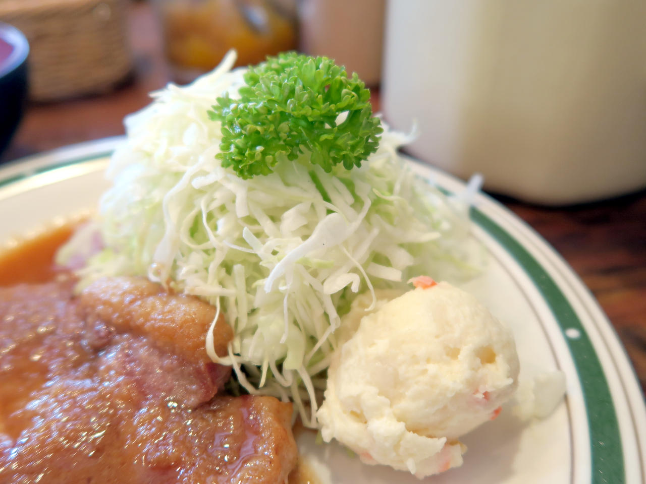 付け合わせはキャベツの千切りとパセリ、ポテトサラダ。