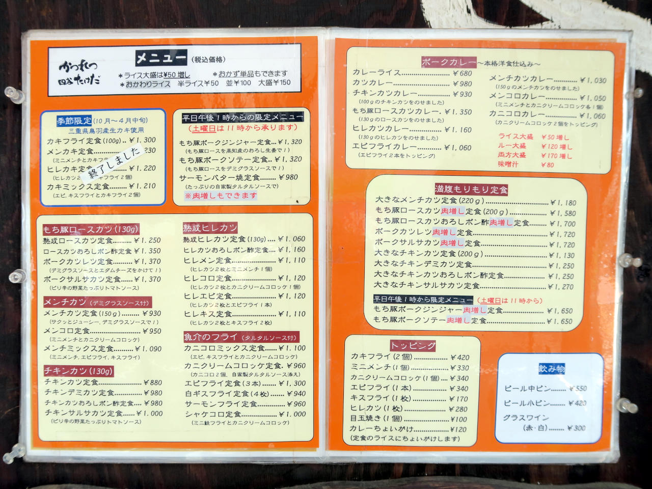 『かつれつ四谷たけだ』には他にもポークカツレツやチキンサルサソースカツ、ポークカレーなどと魅力的なメニューが沢山あるので、カキバター焼のシーズン前にまた来たいと思います。