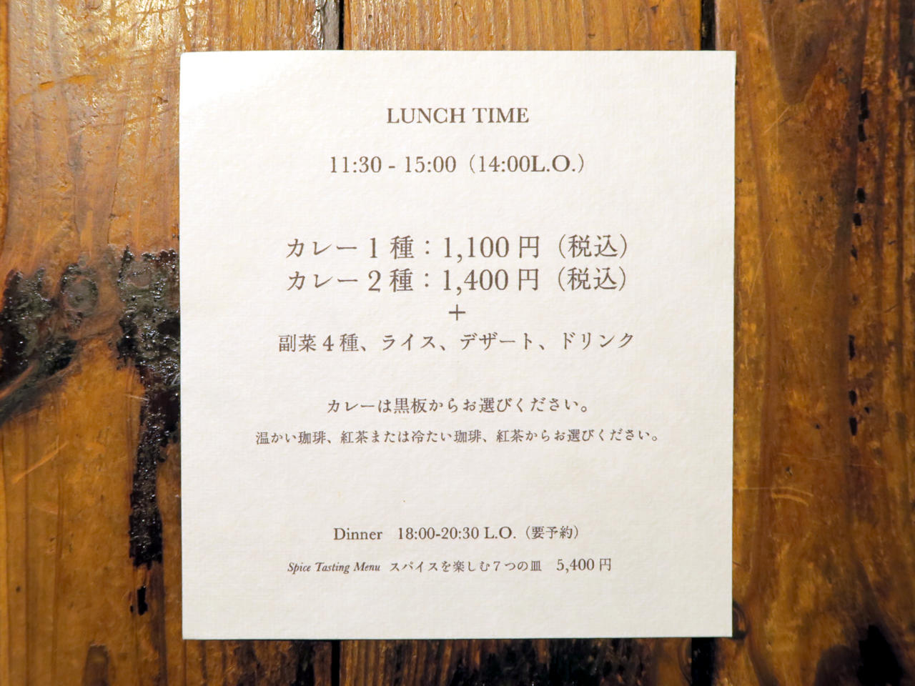 ランチメニューはカレー1種と2種のみで、どちらも副菜4種とライス、デザート、ドリンクが付いています。