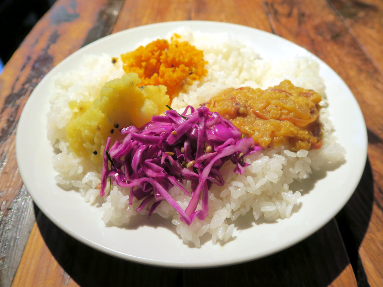 副菜はダルカレー、紫キャベツのマリネ、アルマサラ、人参のポリヤルの4種。