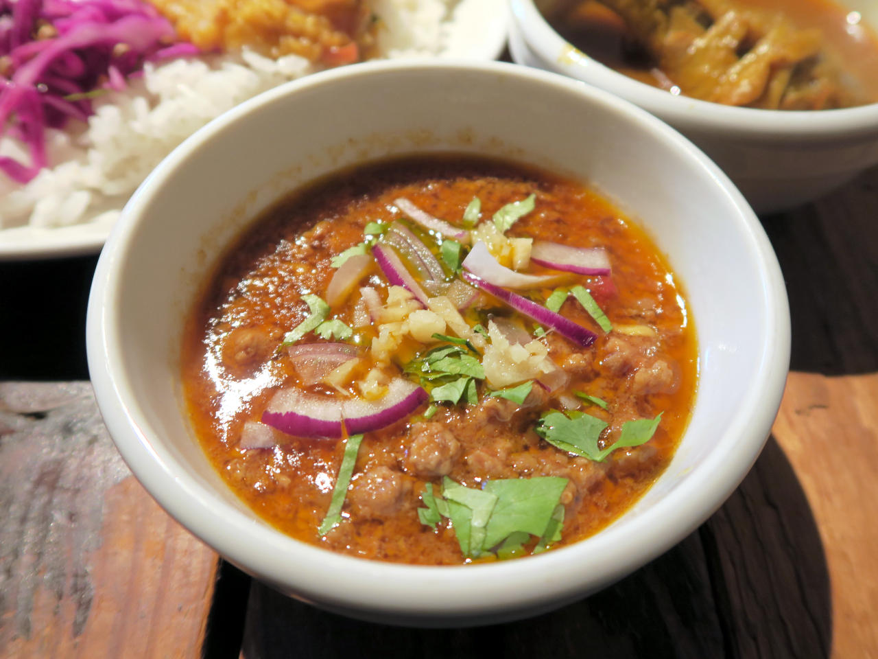 ラムキーマカレーはソースがやや赤みを帯びた茶色をしていてサラサラ。