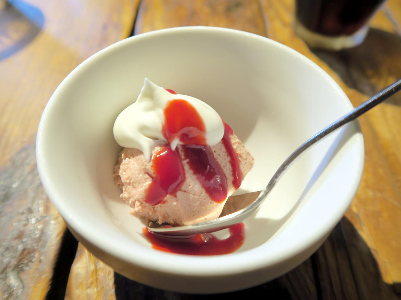 生クリームが乗り、その上にフランワボーズのソースがかかっています。
