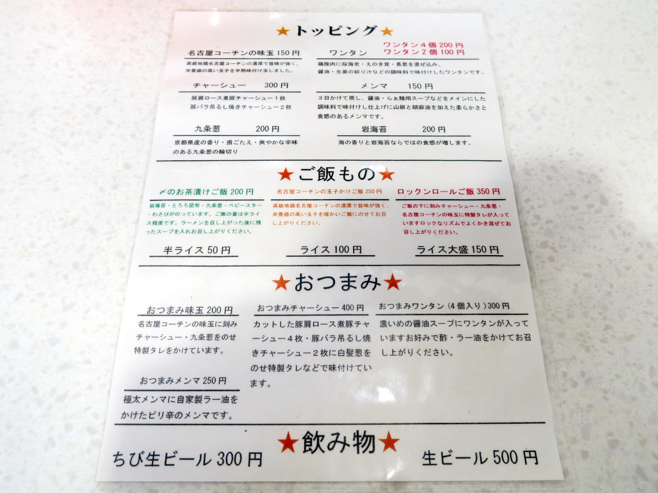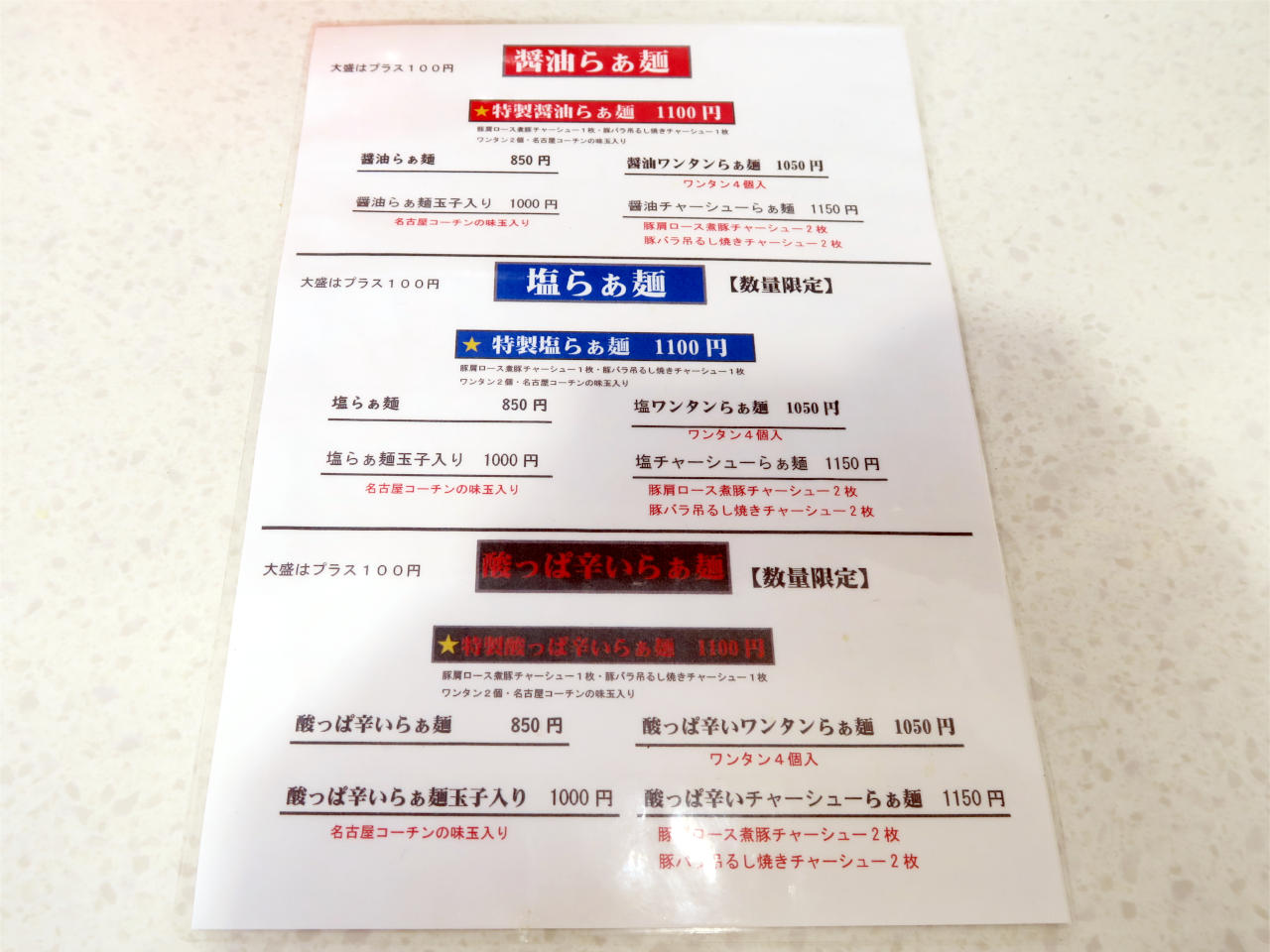 それぞれに、特製、玉子入り、ワンタン、チャーシューのバリエーションがあります。