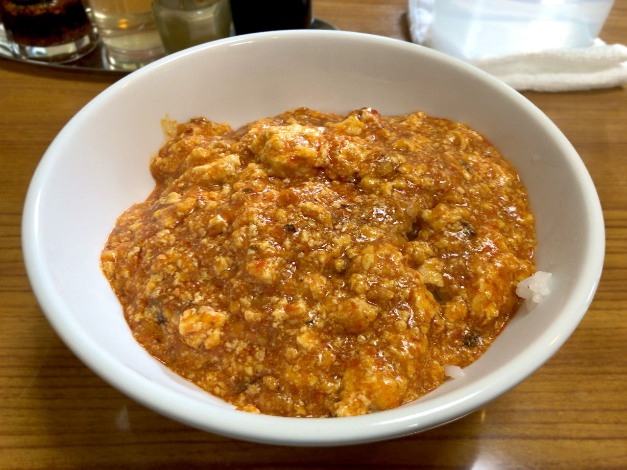 麻婆丼はご飯を覆い隠すように麻婆豆腐がたっぷり乗っています。