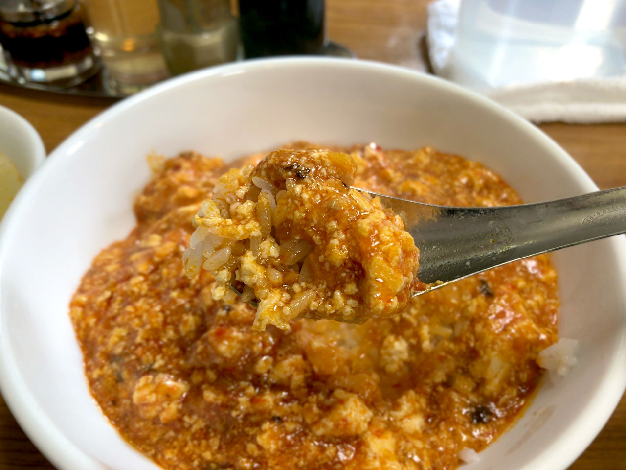 レンゲで口に運ぶと、滑らかな舌触りの麻婆餡と豆腐、豚挽き肉、米一粒ひと粒が口中で混ざり合い、辛み、旨み、甘みが広がります。