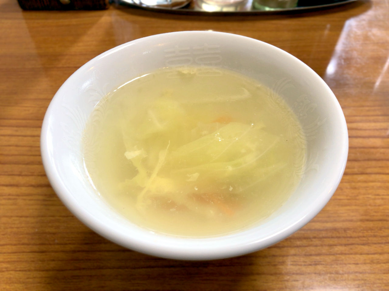 スープはキャベツとニンジンが入ったあっさり塩味。