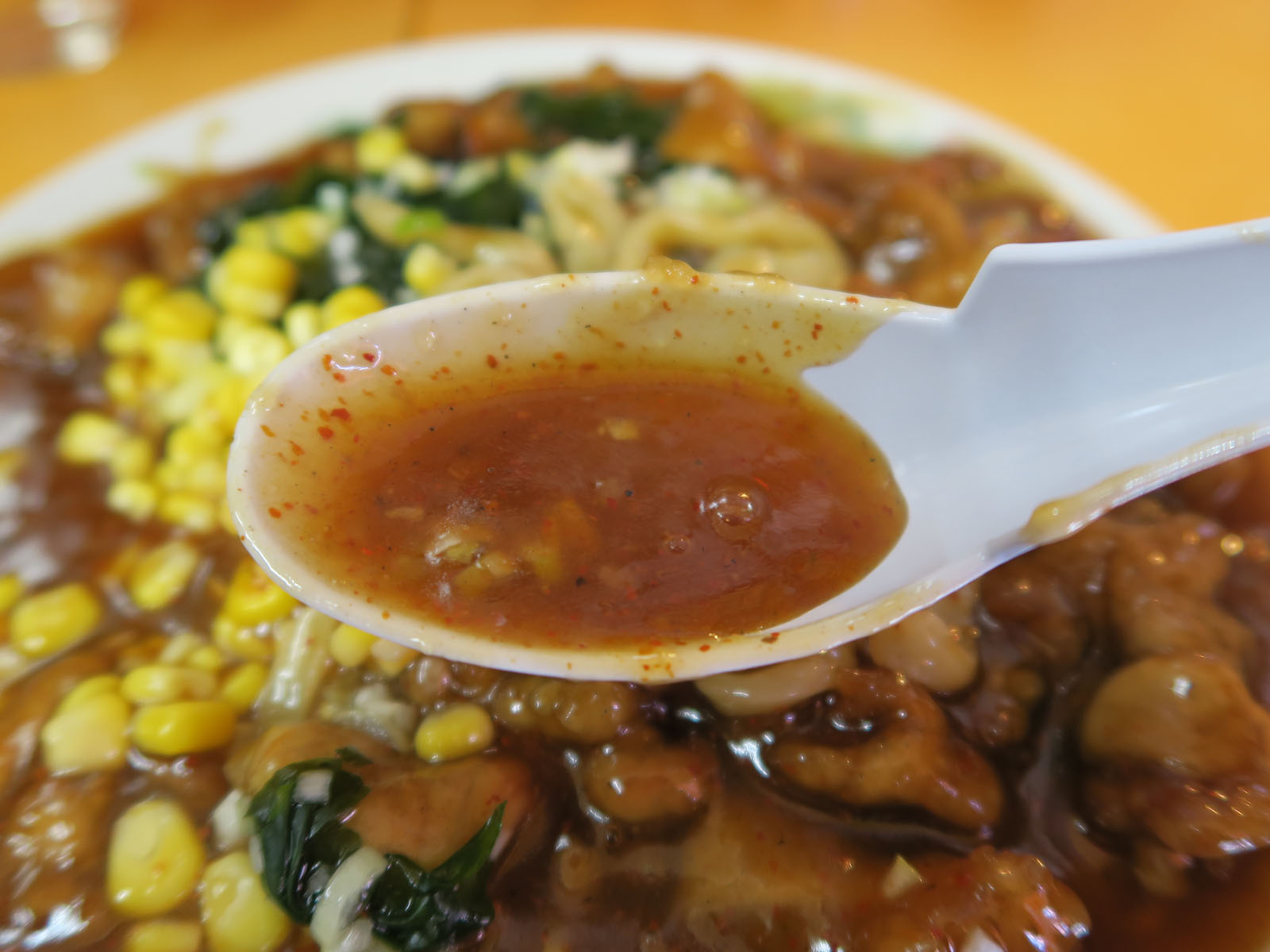 コーンとワカメはピリリとした辛さの餡との相性が良く、箸休め的な役割を担っています。