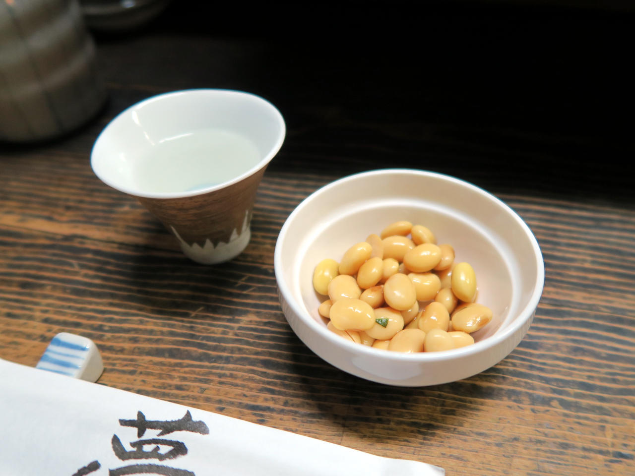 炊いた大豆を酢に漬けたお店の名物メニューだそう。