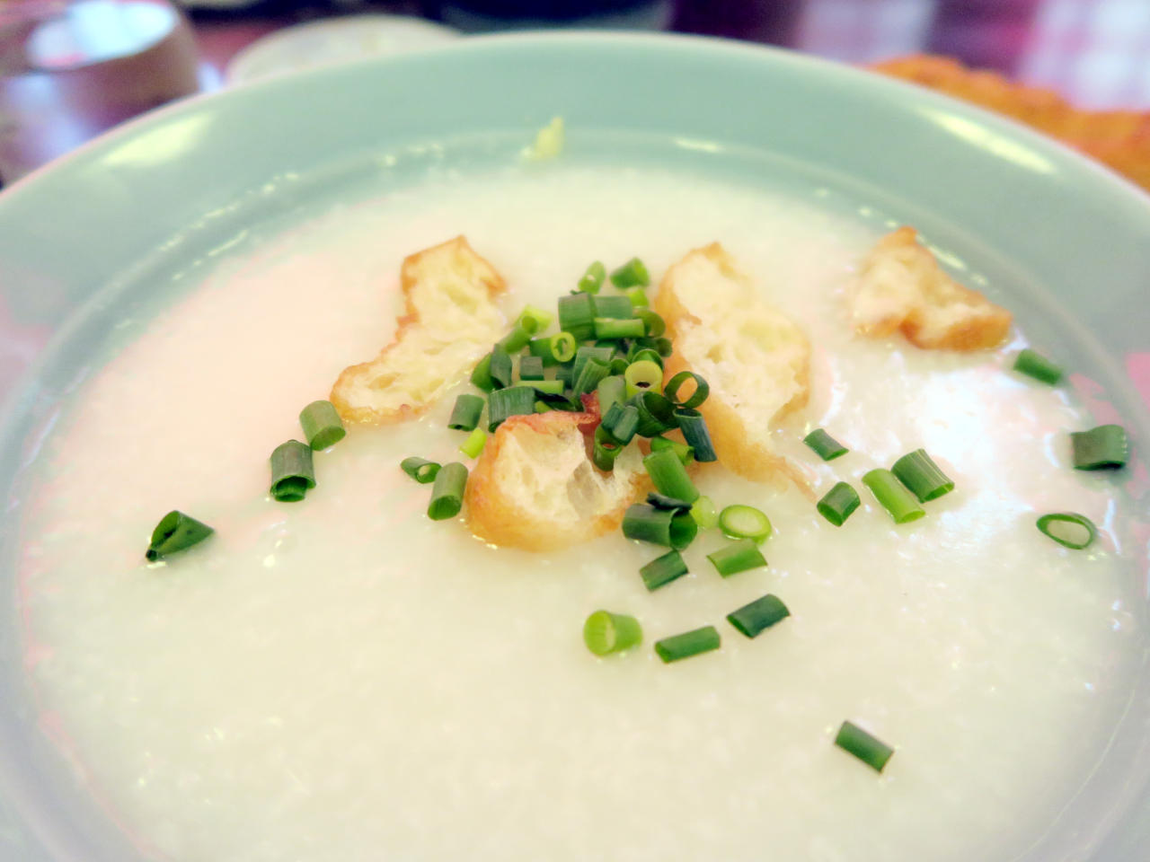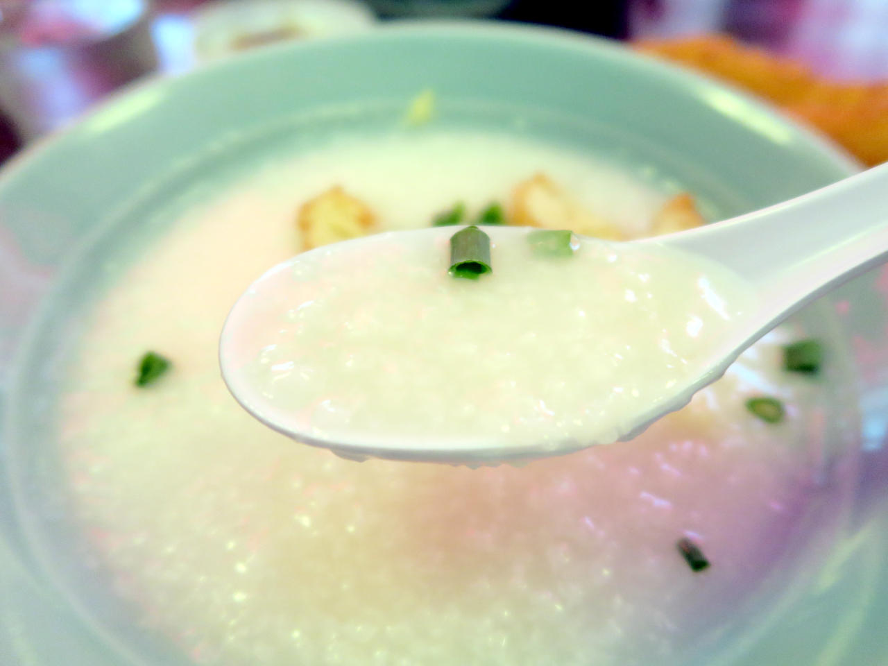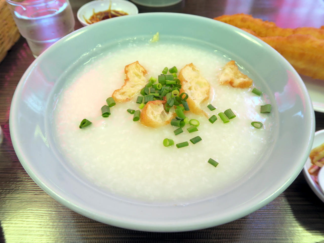 お粥には長ネギと醤油が入った小皿が付いてくるので、味を変えて楽しむことができます。