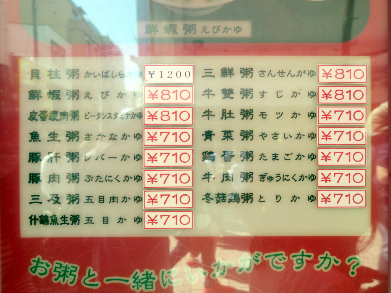 メニューはお粥だけで15種類あり、他にも八宝菜や麻婆豆腐、エビチリ、やきそば、春巻など中華料理の定番が揃っています。