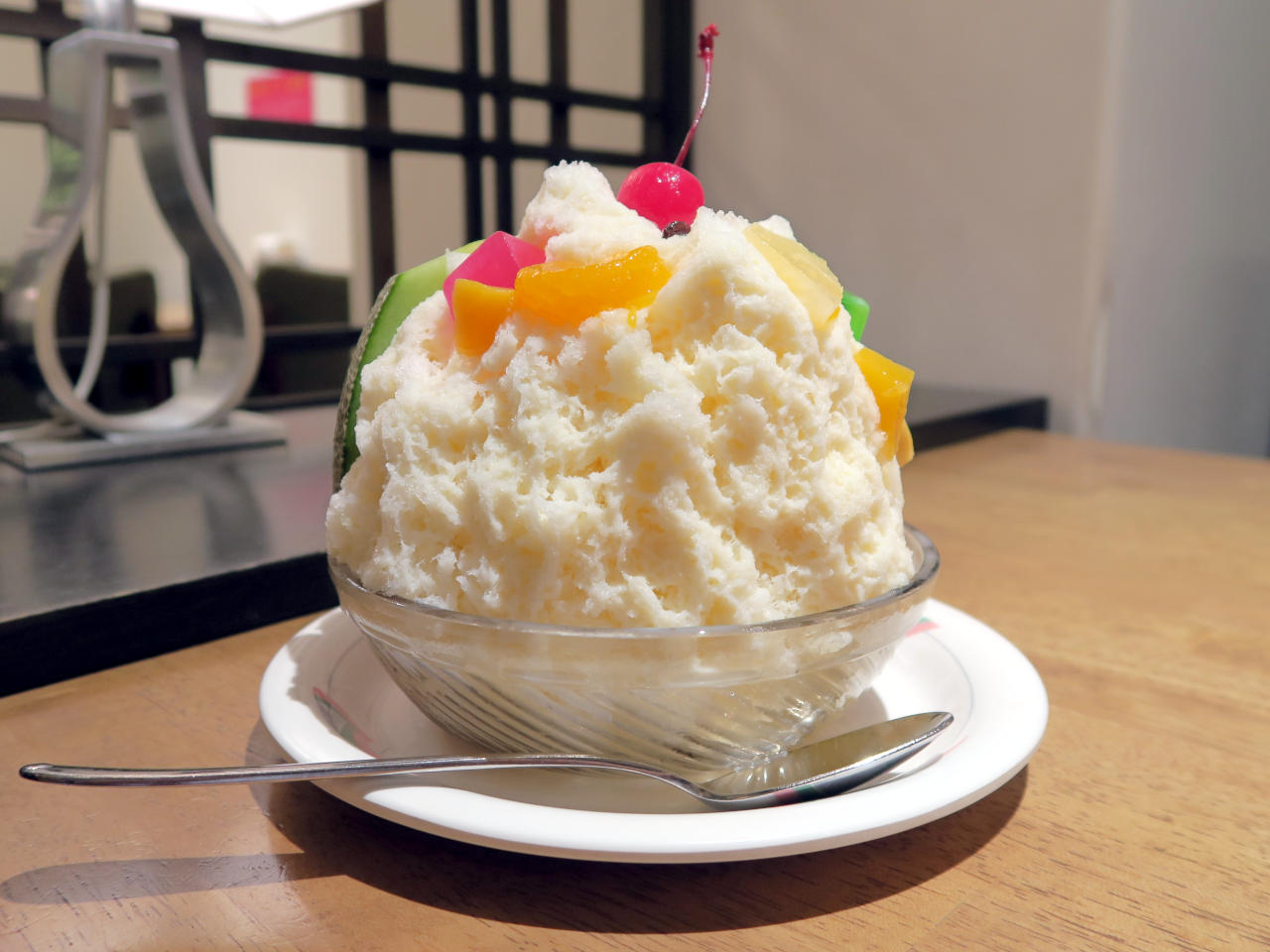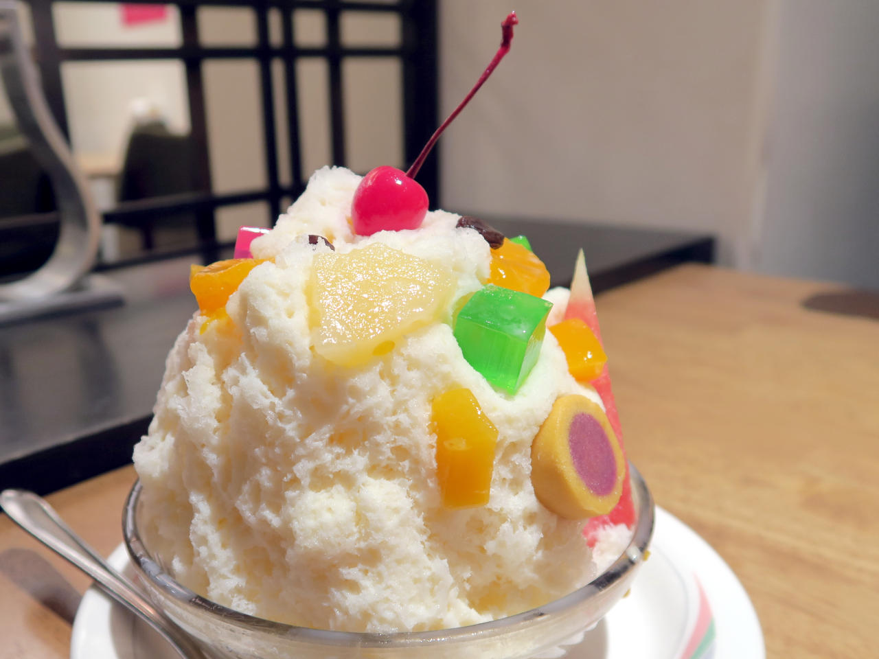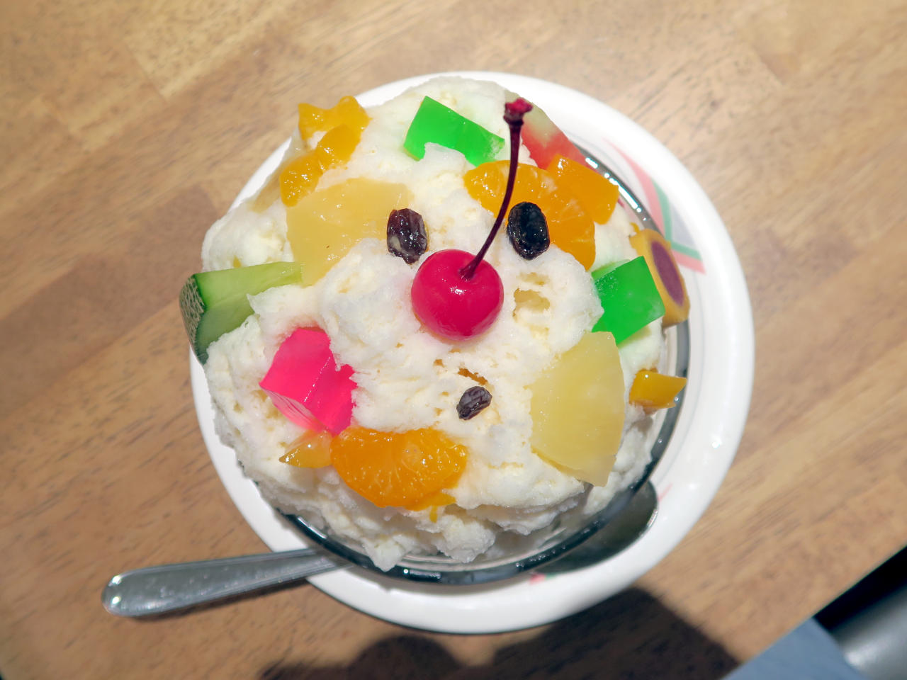 かき氷には自家製ミルクと蜜がたっぷり掛けられていて、フルーツは季節によって変わるそうですが、この日はチェリー 、レーズン 、みかん、黄桃、パイナップル、メロン、スイカ、寒天(赤・緑)、スイートロール、十六寸豆などがトッピングされていました。