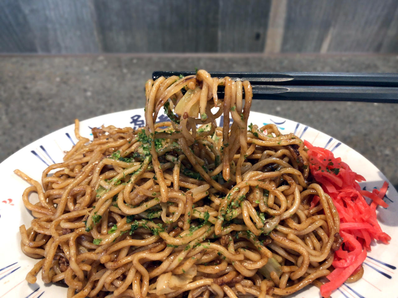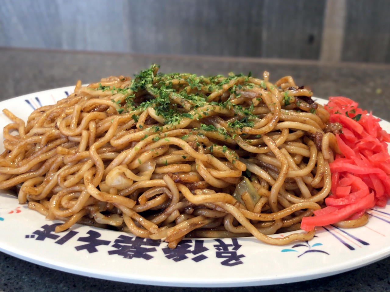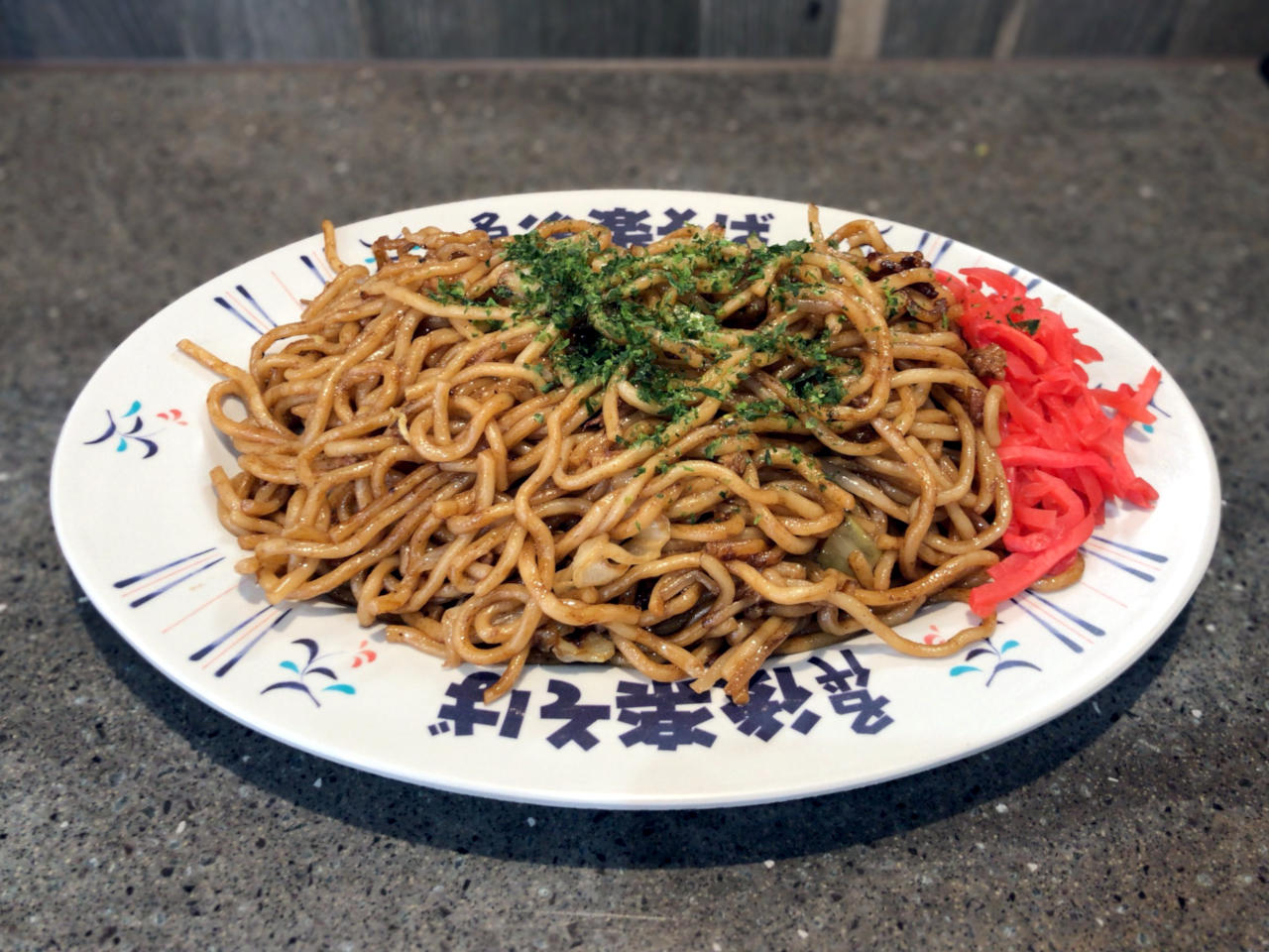 やきそばはキャベツとモヤシ、豚挽き肉が少量入っていて、仕上げに青のりをふりかけ、紅生姜が添えられています。