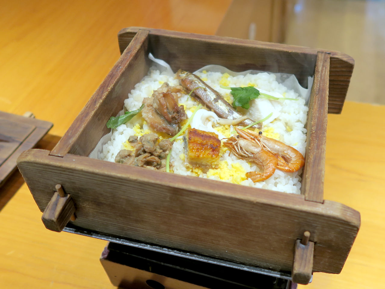 宍道湖七珍せいろごはんは蒸篭で蒸したご飯に宍道湖七珍がのっています。
