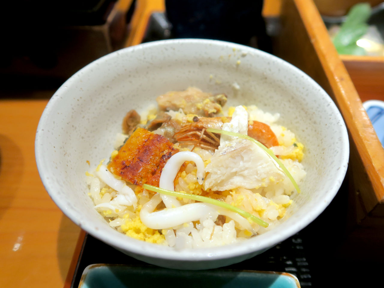 宍道湖七珍せいろ膳は宍道湖七珍せいろごはんと季節の九角、茶碗蒸し、だし汁、香の物がセットになっています。
