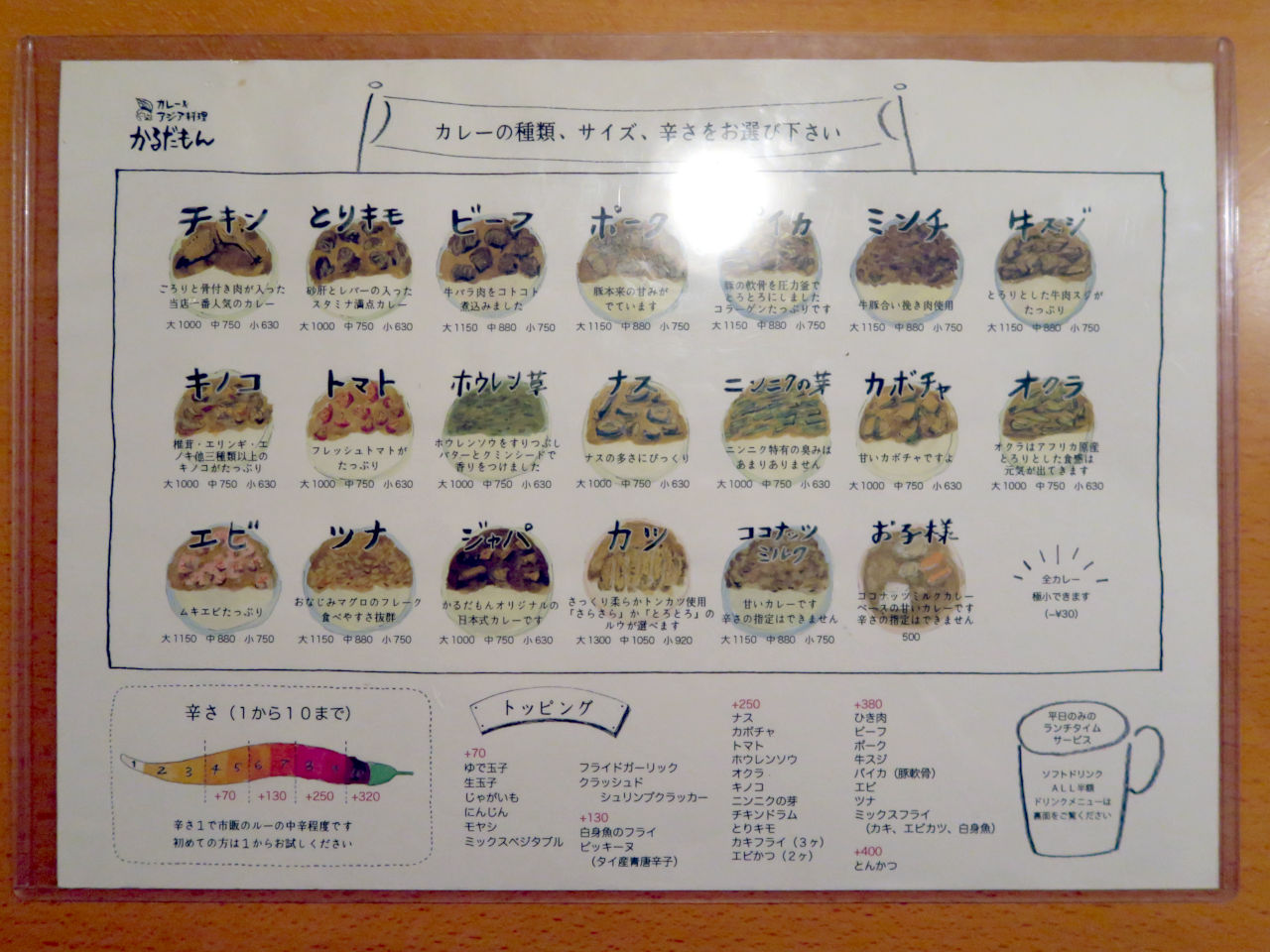 カレーは20種類あり、サイズが大・中・小から選べ、辛さも1から10まで選べます。