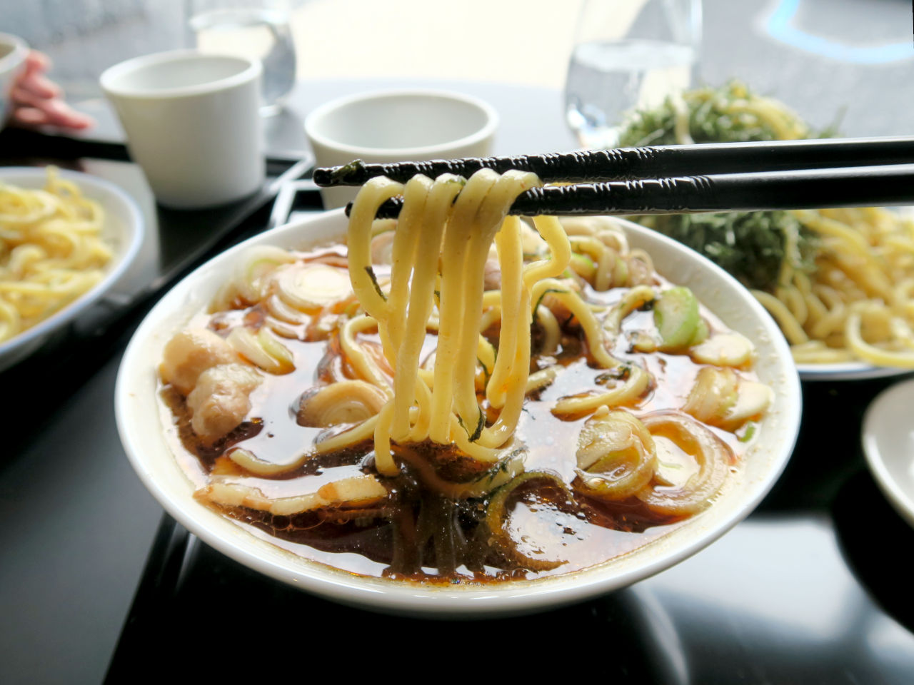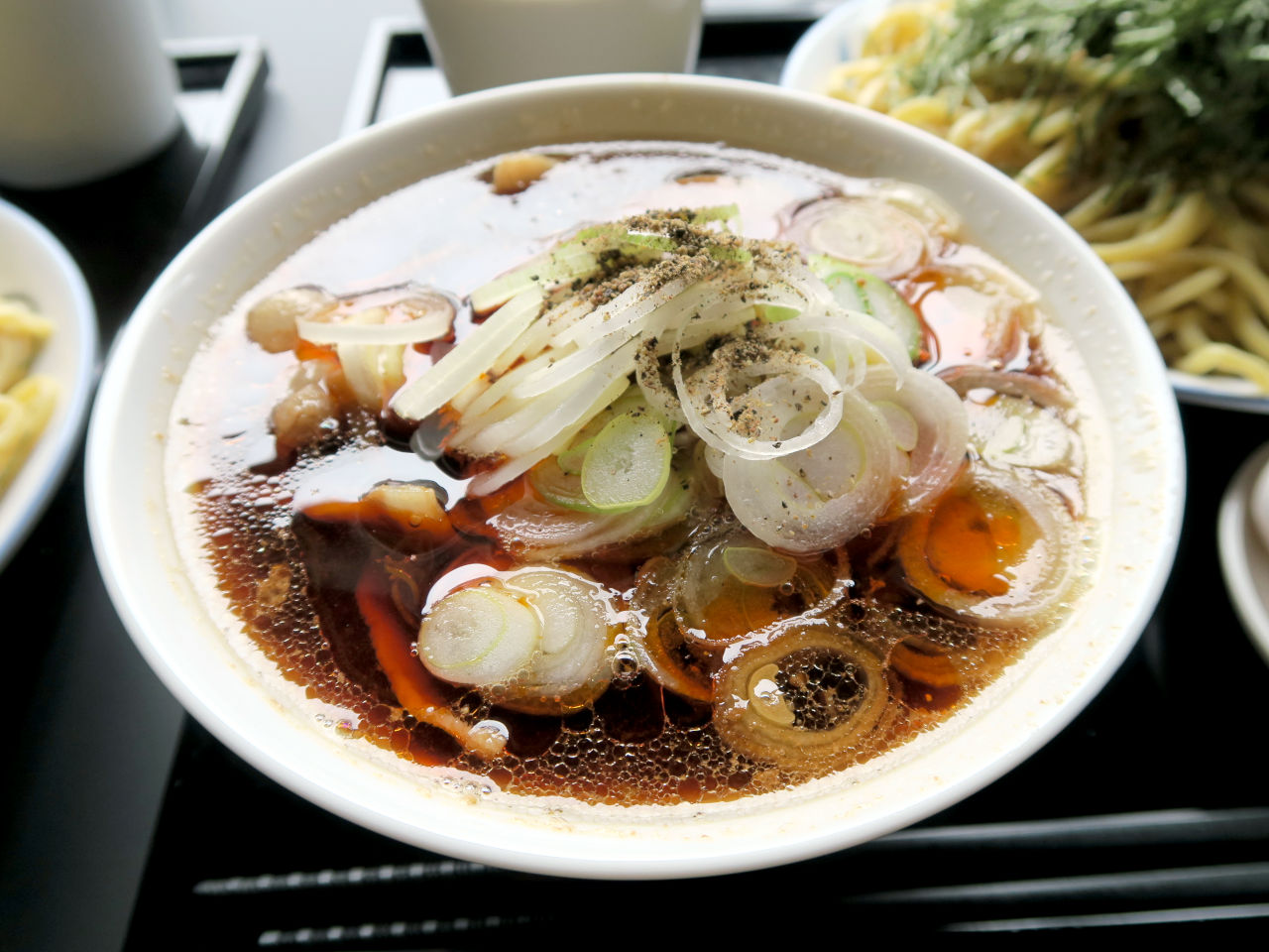 つけ汁はカエシが濃くて、そこにたっぷりのラー油が加わり甘辛。アクセントに胡椒の辛みや山椒のシビレがピリッと効いています。