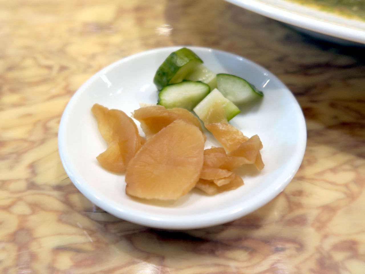 別皿で添えられたのはきゅうりのピクルスと福神漬け。