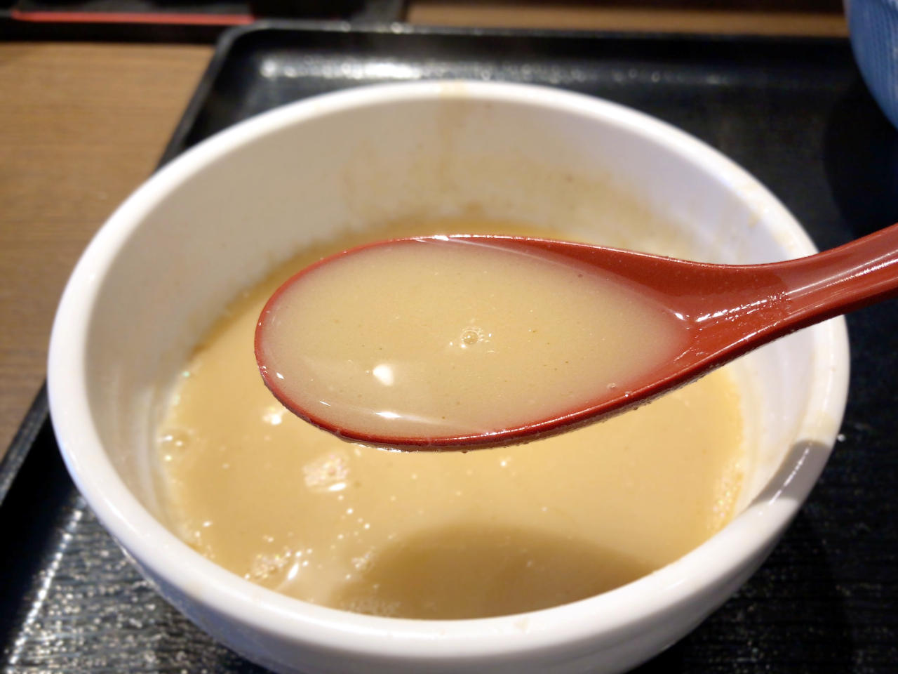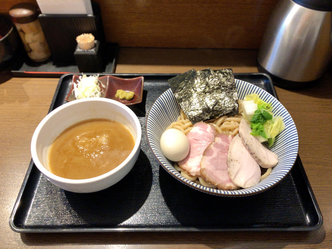麺と具を食べ終えたら、つけ汁に卓上のポットから割スープを注いでスープ割り。