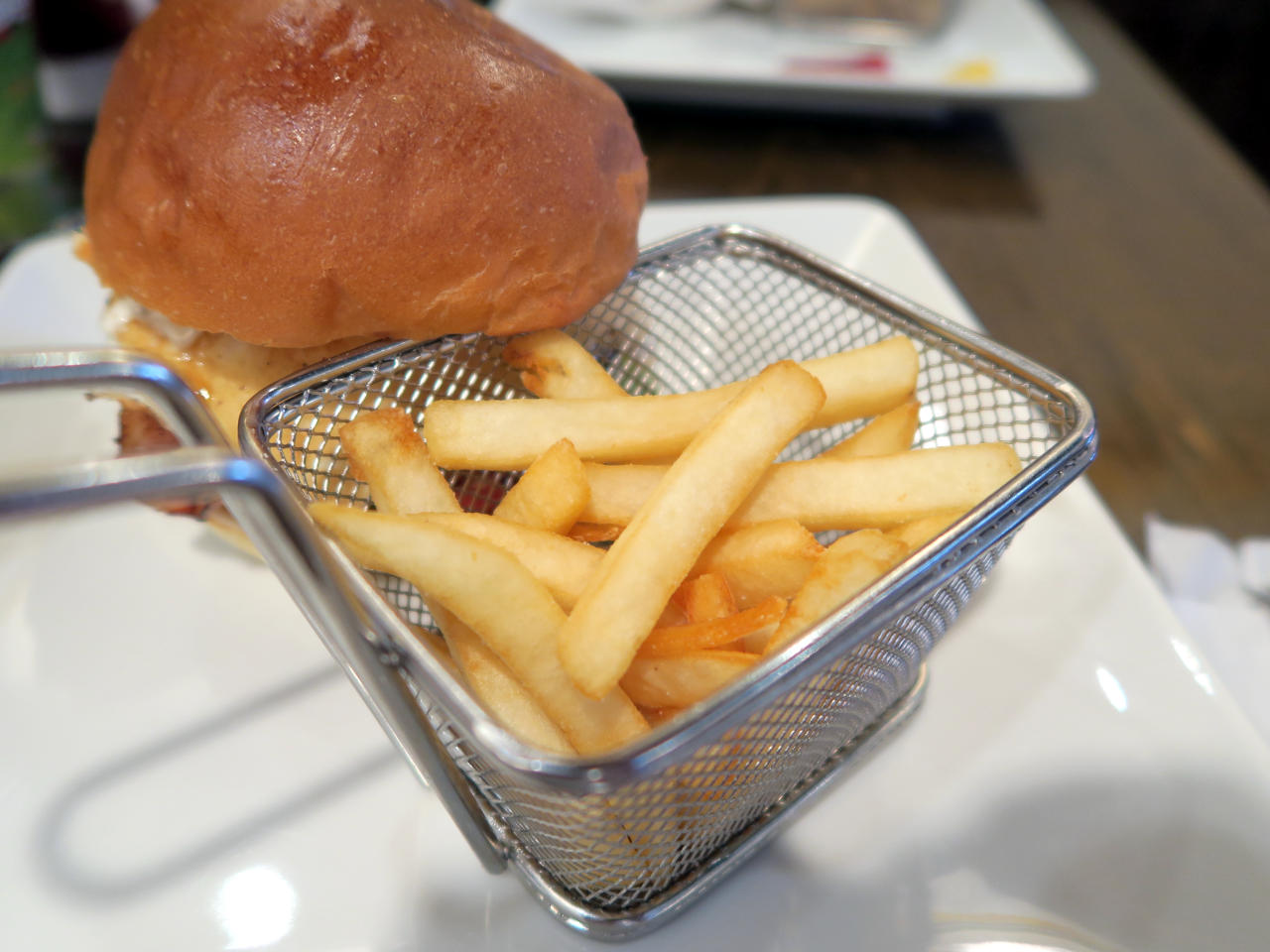 フレンチフライは太めのストレートカットで、小さなポテトフライヤーに入っています。