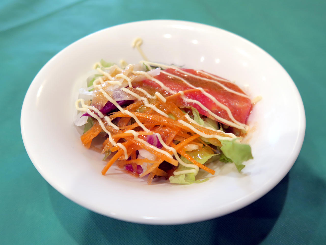 サラダはレタス、紫キャベツ、トマト、ニンジン、タマネギに、オニオンドレッシングとマヨネーズがかかっています。